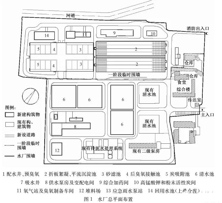 (1)構(gòu)筑物多、設(shè)備陳舊、總圖凌亂。水廠自建成的近60年時(shí)間里,先后經(jīng)歷多次擴(kuò)容、改造,形成了現(xiàn)在多個(gè)處理構(gòu)筑物,總圖布置分散、凌亂,且多個(gè)構(gòu)筑物和很多設(shè)備都存在問題。如現(xiàn)有吸水井分為高、低水位2格吸水井,多年運(yùn)行管理實(shí)踐表明高、低水位運(yùn)行切換麻煩,節(jié)能效果也不明顯;加藥間設(shè)備陳舊需要逐一更換,其內(nèi)部布置、土建分隔亦有多處需要改造,而且現(xiàn)有工藝設(shè)備也不能滿足新增加藥劑的要求;水廠的清水池庫容僅2.2萬m3,庫容偏小;2座二級(jí)泵房和2座原水泵房內(nèi)水泵機(jī)組匹配都不合理、效率低下、自動(dòng)化程度低。
